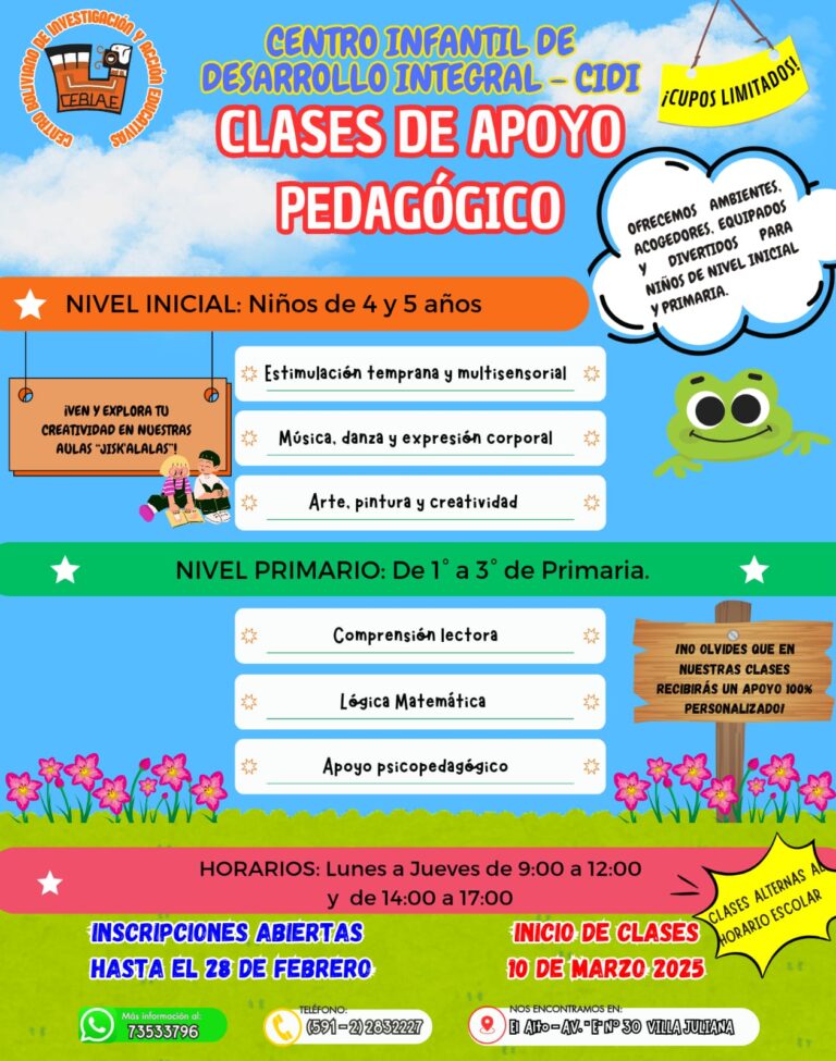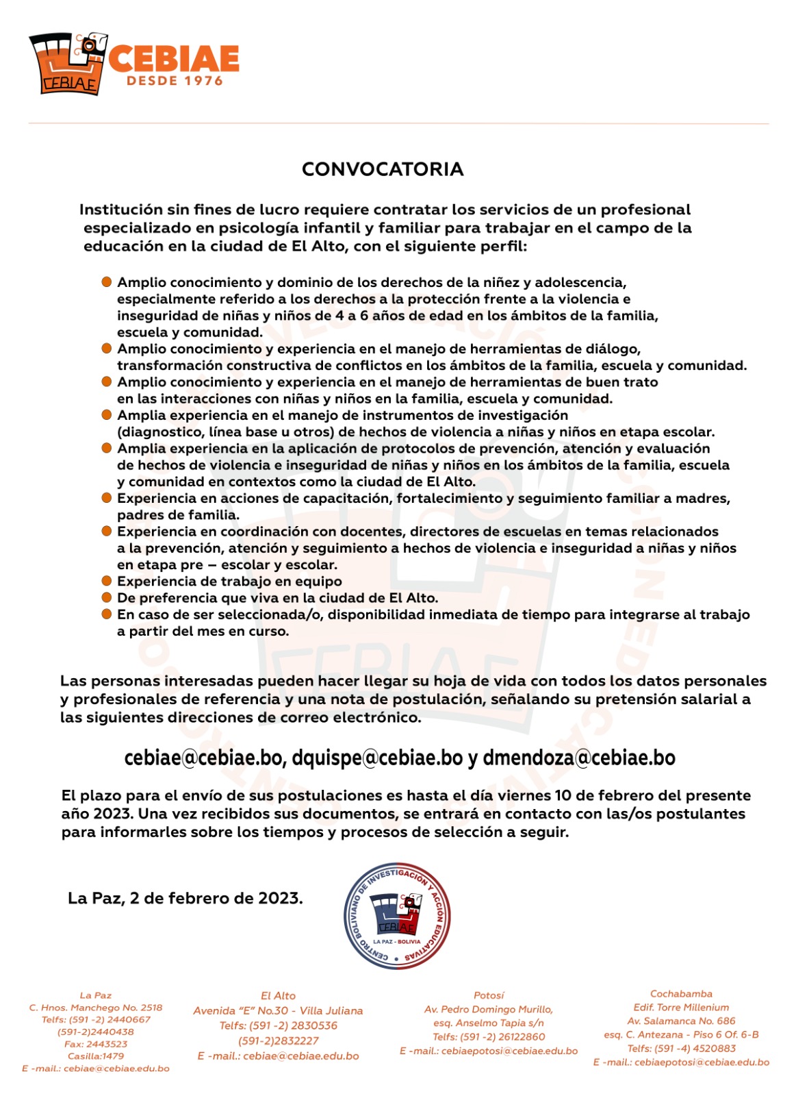 Noticias Educativas Requerimiento de Personal El Cebiae entregó material de apoyo a la educación y material de bioseguridad a cinco Unidades Educativas de El Alto El Cebiae inició el ciclo de salidas familiares con las niñas y niños del Centro Infantil De Desarrollo Integral El Cebiae realizó la Re Apertura del Centro Infantil de Desarrollo Integral CIDI Celebración del día de la reforma. 505 años. Martín Lutero y su camino hacia la Fe y la Paz Algunos ejemplos de mujeres durante la Reforma